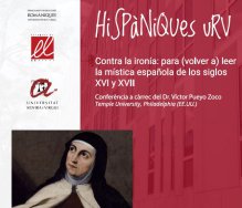 El próximo viernes 13 de julio a las 12 horas en la Sala de Vistas de Campus Catalunya, el Dr. Víctor Pueyo Zoco, de la Temple University, en Philadelphia, impartirá una conferencia que se titula "Contra la ironía: para (volver a) leer la mística española de los siglos XVI y XVII".